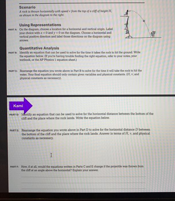 So the Answer in D. Scenario A rock is throws horizontally with speed v from the tip of a cliff of height H as shown in the diagram to the right. The greater the initial speed v 0.